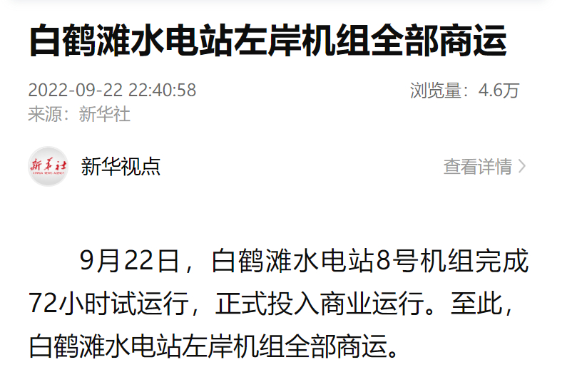 9月22日,白鹤滩水电站8号机组完成72小时试运行,正式投入商业运行 。至此,白鹤滩水电站左岸机组所有商运 。