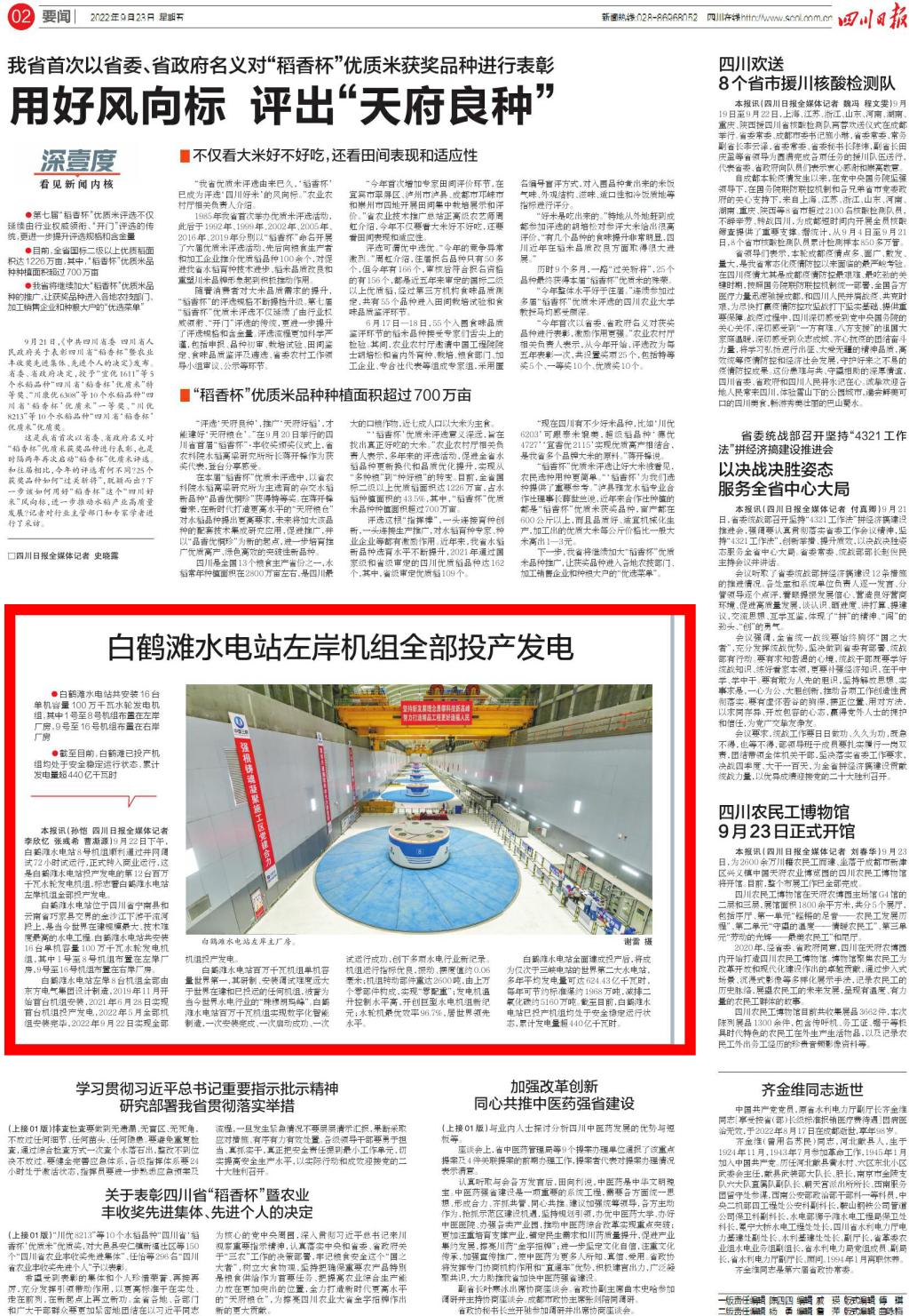 本报讯(孙恺 四川日报全媒体记者李欣忆 张彧希 曹凘源)9月22日下昼,白鹤滩水电站8号机组顺遂通过并网调试72小时试运行,正式转入商业运行,这是白鹤滩水电站投产发电的第12台百万千瓦水轮发电机组,标记着白鹤滩水电站左岸机组所有投产发电。