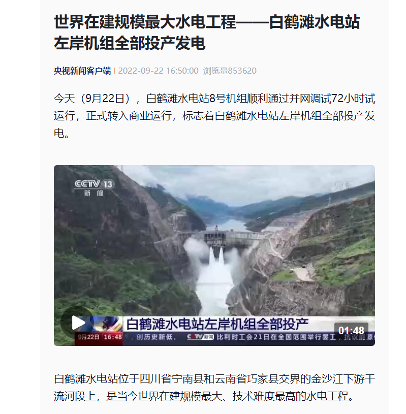 [央视新闻]天下在建规模最洪流电工程——白鹤滩水电站左岸机组所有投产发电
