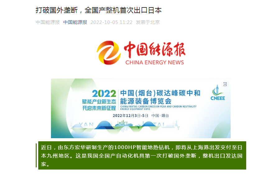 ±¾´ÎÑéÊÕµÄÈÕ±¾1000HPÖÇÄܵØÈÈ×ê»ú´îÔØ¶«·½ºê»ª×ÔÖ÷Ñз¢µÄÈ«Ì××Ô¶¯»¯»ú¾ß£¬ÕâÊÇÎÒ¹úÌìϲú×Ô¶¯»¯»ú¾ßµÚÒ»´ÎÍ»ÆÆÍâÑó¢¶Ï¡¢Õû»ú³ö¿ÚÅ¹ú¼Ò£¬±ê¼Ç×ÅÎÒ¹ú×ê»ú×Ô¶¯»¯¿ØÖÆË®Æ½»ñµÃ¹ú¼Ê¸ß¶ËÊг¡ÈϿɡ£