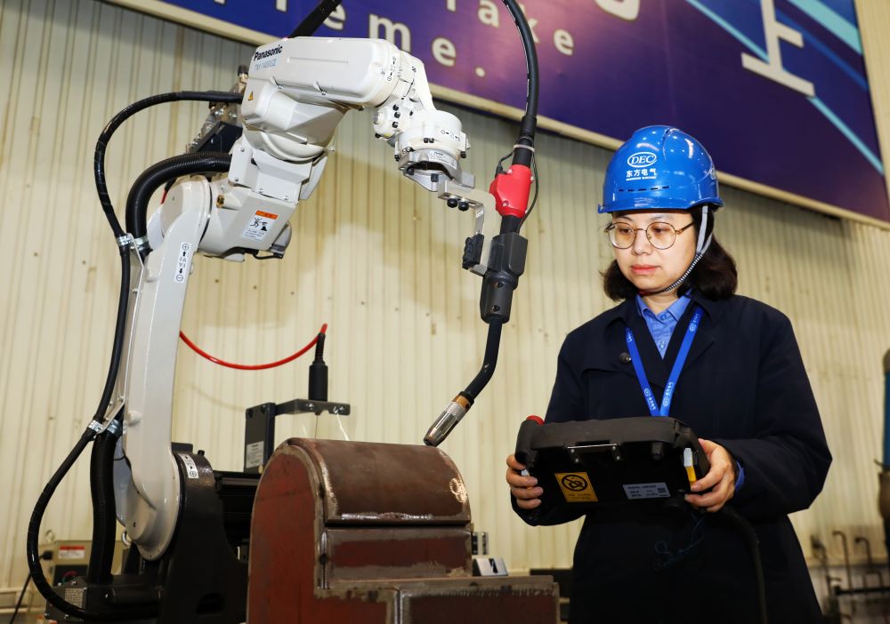 天下人大代表曹天兰正在举行焊接机械人模拟试验。贾伟明摄