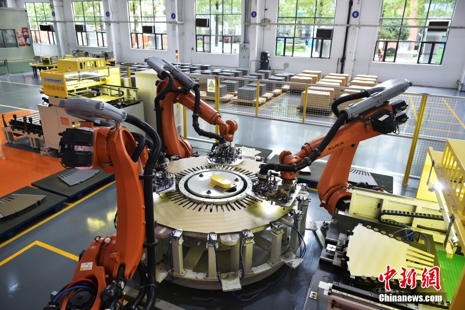 除了大型清洁能源装备重型制造数字化车间,东方电机尚有另一个“明星车间”——全球首个定子冲片绿色“无人车间”。图为“无人车间”里的机械人在举行叠片作业。