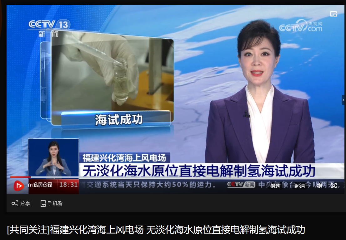 [央视配合关注]福建兴化湾海优势电场 无淡化海水原位直接电解制氢海试乐成