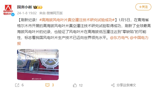 【刷新纪录!#高海拔风电叶片真空灌注手艺研究试验乐成#】1月5日,在青海省格尔木市开展的高海拔风电叶片真空灌注手艺研究试验取得乐成,刷新了全球最高海拔风电叶片的纪录,也验证了风电叶片在高海拔低压灌注抵达“零缺陷”的可能性,标记着我国风电叶片生产手艺已迈向天下领先水平。@凯时官网@中国电力报
