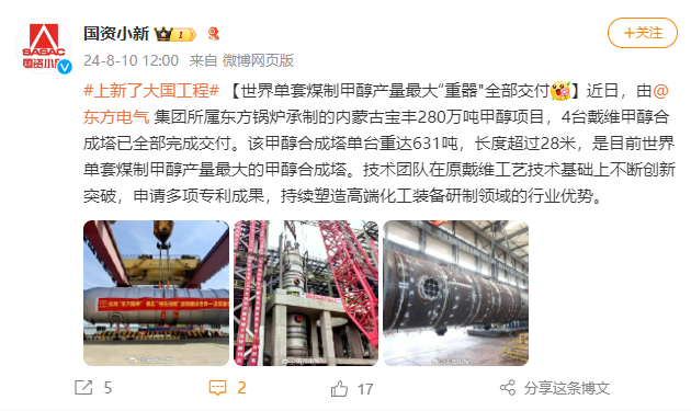 [国资小新]#上新了大国工程# 【天下单套煤制甲醇产量最大“重器"所有交付】