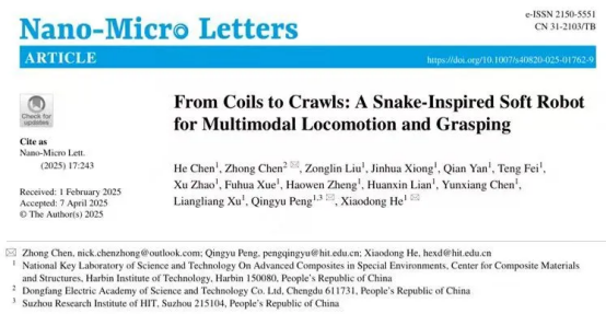 Ïà¹ØÐ§¹ûÒÔ¡¶From Coils to Crawls: A Snake-Inspired Soft Robot for Multimodal Locomotion and Grasping¡·ÎªÌ⣬¶«·½Ñо¿Ôº³ÂÖÙ²©Ê¿Óë¹þ¶û±õ¹¤Òµ´óѧºÕÏþ¶«ÔºÊ¿¡¢ÅíÇìÓî½ÌÊÚΪÅäºÏͨѶ×÷Õß¡£